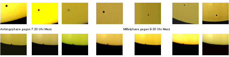 Die Bilder entstanden am Caude-Refraktor der Schweriner Sternwarte, Brennweite 2200 mm in Verbindung mit einer Philips Toucam mit 30 Bilder pro Sekunde. Die Aufnahmetechnik wurde hier schon beschrieben. Die Avi Files wurden mit Uranos in Einzelbilder zerlegt mit verschiedenen Filtern vorgeschärft und dann nach Qualität sortiert. Die besten Bilder wurden dann aufaddiert und mit Filtern nachgearbeitet. Den letzten Feinschliff bekamen die Bilder dann mit Photoshop. Beim Merkuraustritt ist sehr schön das Tropfenphänomän zu sehen. Es handelt sich aber hierbei um eine optische Täuschung. http://www.astronomischer-verein-schwerin.de |